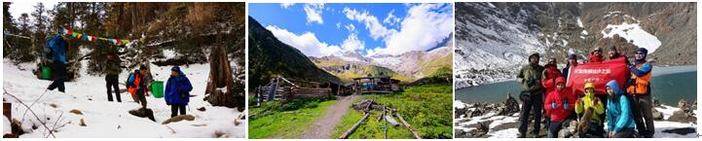 清晨7点用完早餐后, 从住宿地出发,★经高海拔原始森林及杜鹃丛林,徒步将近2小时后翻过海拔3900米的上那宗拉丫口,直至雨崩河河底,随后穿过一片原始松树林,★约1小时后抵达海拔3600米的中日联合登山队“笑农大本营”。1991年中日联合登山队修建而成,是登梅里雪山卡格博峰的一个大本营,去雨崩村旅游必去的一个地方,风景优美。我们在大本营稍作休整,吃过干粮后继续向前,约1.5小时后抵达海拔3800米的冰湖,★冰湖是梅里雪山冰川融化的雪水汇集而成形成的深绿的海子,被称为梅里雪山的圣湖。游览完冰湖原路返回,于18点左右返抵雨崩村。