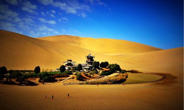 月牙泉,古称沙井,俗名药泉,自汉朝起即为“敦煌八景”之一,得名“月泉晓澈”。月牙泉弯曲如新月,因而得名,有“沙漠第一泉”之称。一弯清泉,涟漪萦回,碧如翡翠。泉在流沙中,干旱不枯竭,风吹沙不落,蔚为奇观。