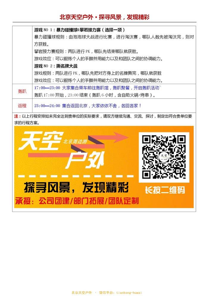 三、活动线路:根据您的要求、制定您满意的线路,定制旅行、专业拓展、新人培训、企业年会、休闲腐败、徒步登高、野炊烧烤、漂流、露营、国内外经典线路均可。