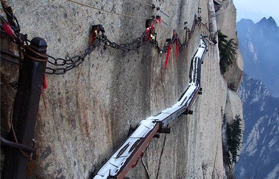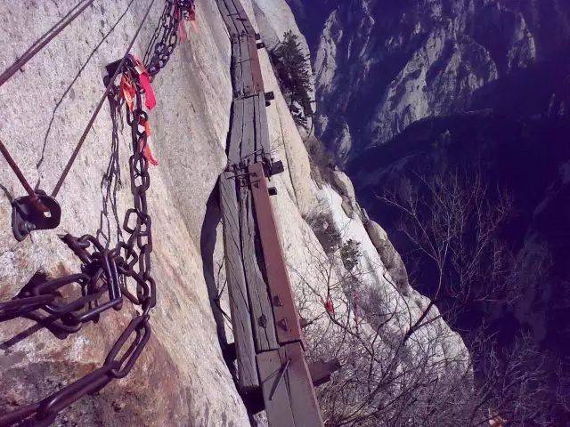 西岳华山历来被认为是五岳之中最为险峻的,特别是具有700多年历史的长空栈道,在华山南峰东侧山腰的万仞绝壁上凿出来的几个踏脚之处,镶嵌石钉搭木椽搭建了一个百余米悬空的栈道,让人望而却步。
