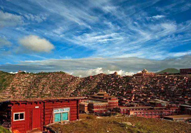 色达的五明佛学院,世界上最大的藏传佛学院之一。密密麻麻红色的房子铺满了一整座山,仿佛进入了红色的过度,蔚为壮观。