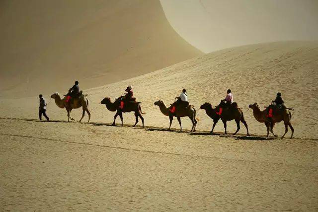 在广袤的沙漠中,骑在沙漠之舟上遨游,任由骆驼一颠一颠的行走着,感受这不一般的西北大漠风光。