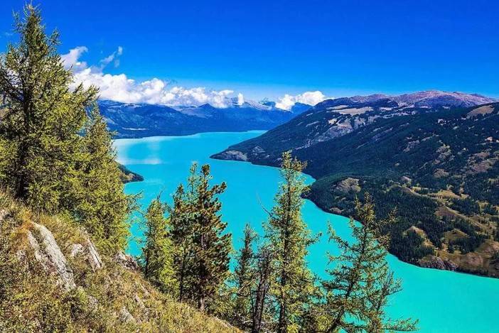 蓝色的喀纳斯湖像一块宝石盛放在森林之间