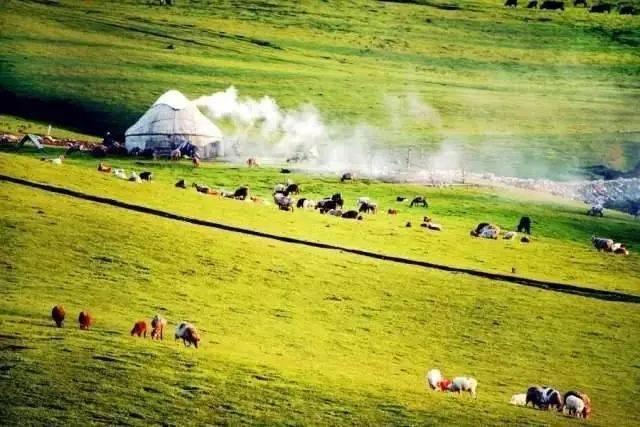 那拉提空中草原上牧民搭起帐篷,升起炊烟