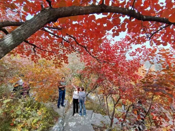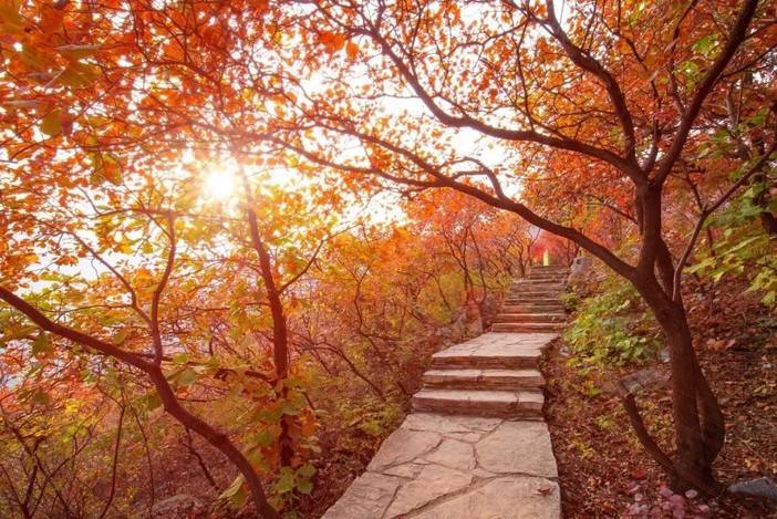 上午|到达坡峰岭景区,休整后开始登山赏红叶,坡峰岭视野开阔,上下山环形总行程6公里,大多为石阶路,坡度很缓,该条环山栈道被称之为可以走进心脏的山路;