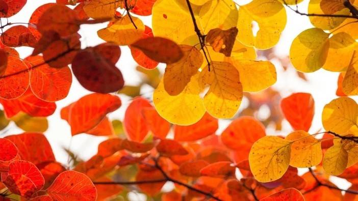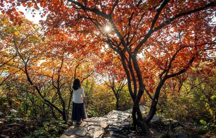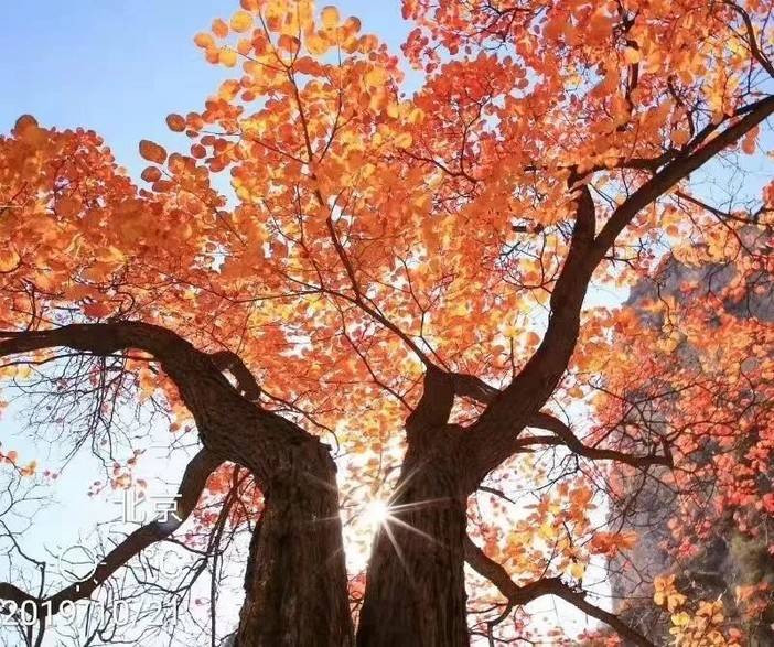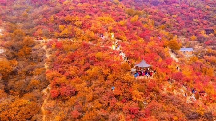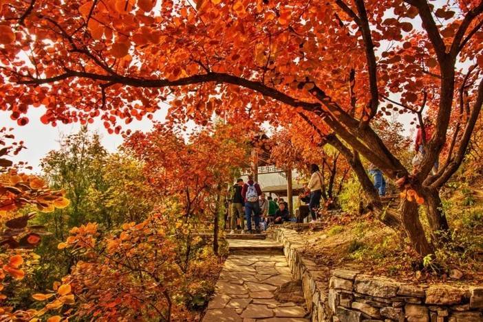 黄栌、元宝、火炬等树种已经呈现不同的颜色,视觉由远及近,颜色由黄绿相间转向浓红淡黄,迥然不同的色彩让坡峰岭傲然独立。