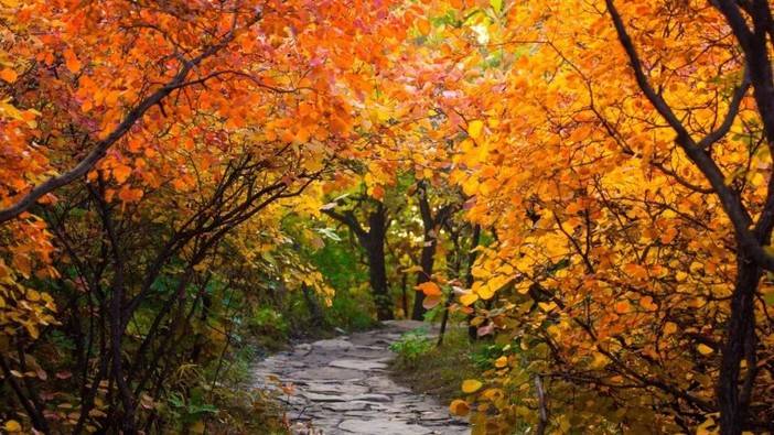 山势平坦易于攀爬,石板路蜿蜒而上,不同树种的叶子红黄交错,在阳光下闪闪发光,美丽极了!红叶需经历风雨而成,在衰败前,他们燃烧生命,怒放灿烂!