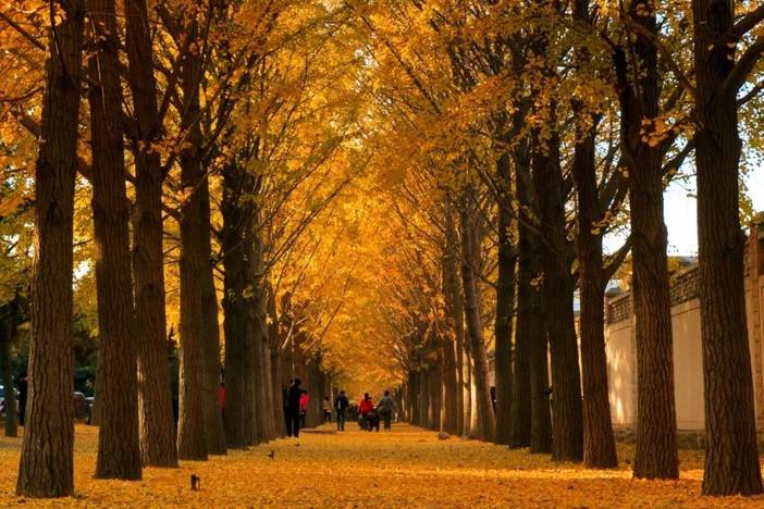 每到深秋好时节,大大小小的银杏树满树金黄将这条街装点得素气大方,树下的芳草地被厚厚的金色的银杏树叶覆盖,踩起来“沙沙”作响。笔直的银杏大道里面是满满的人流,欣赏杏叶的老人孩子,拍婚纱照的浪漫情侣,举着长枪短炮的“拍客”,支起画板的“画家”,都是林中一景。