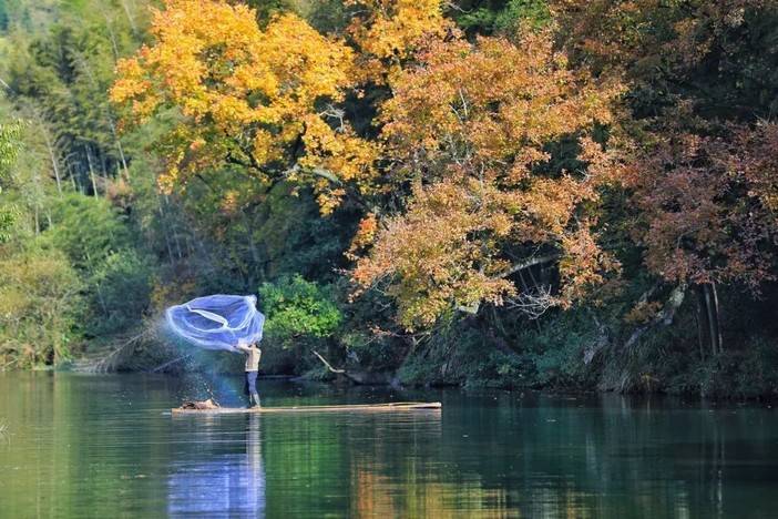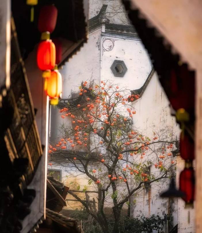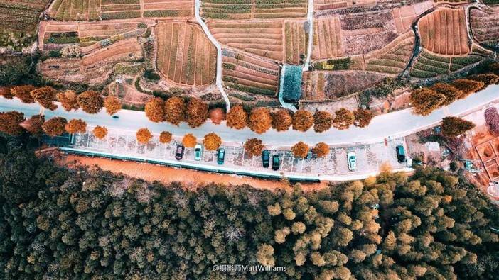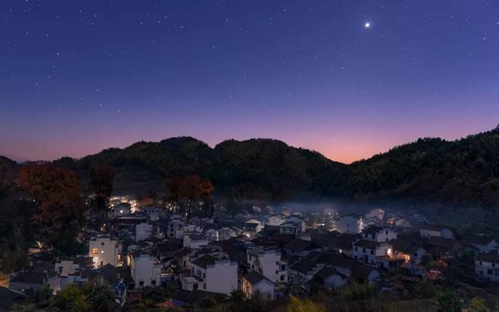 点亮火红的枫叶与白墙黑瓦的村落点缀