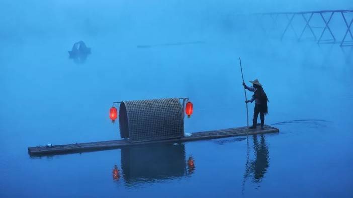 摇着船桨的渔夫成了一道黑色的剪影