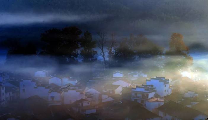 日出前蒙蒙晨雾和着农家清晨的炊烟