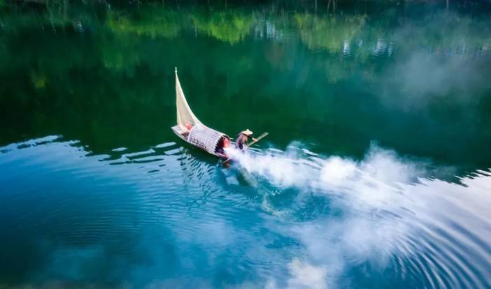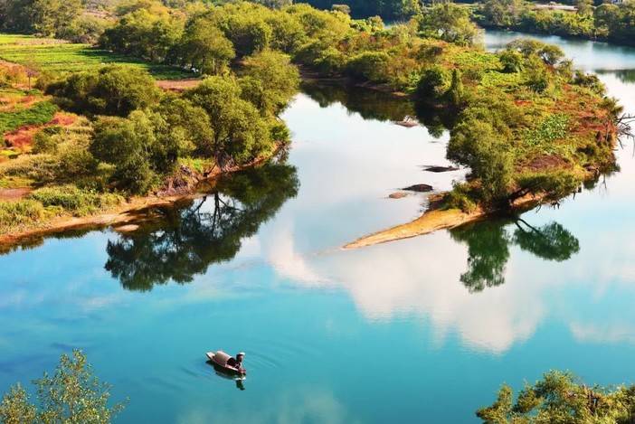 竹筏轻轻从月亮湾的水面划过