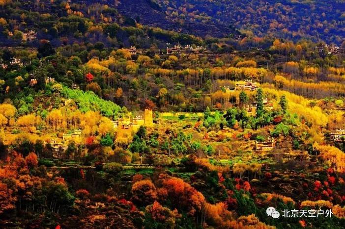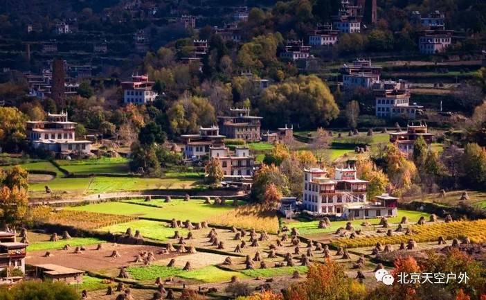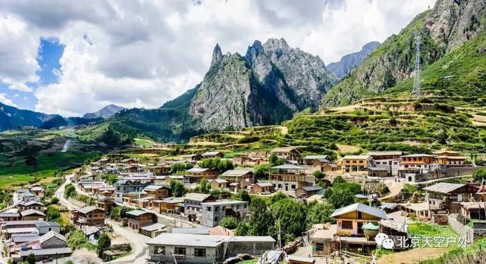 整个山寨依着起伏的山势迤逦连绵,在相对高差近千米的山坡上,一幢幢藏式楼房洒落在绿树丛中。