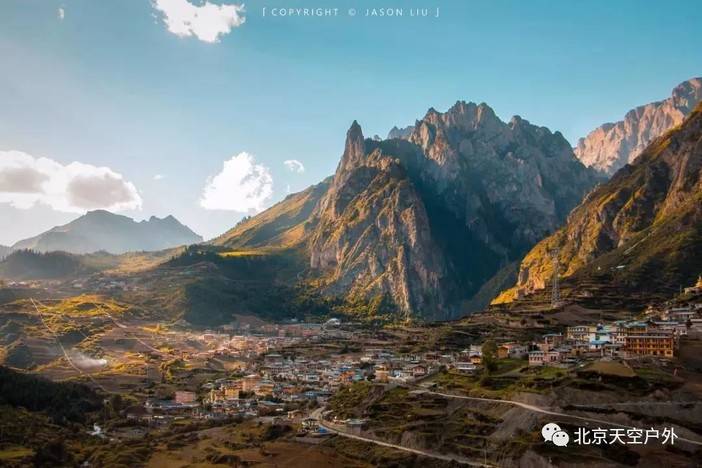 “甲居”,藏语是百户人家之意。藏寨从大金河谷层层向上攀缘,一直伸延到卡帕玛群峰脚下。