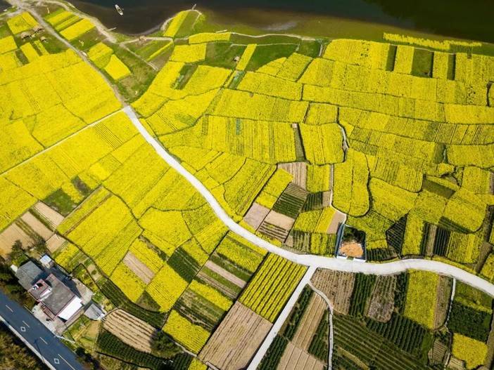 古朴的建筑和大片的油菜花交相辉映,层层梯田,片片花海,一时间满金流动、馥郁芬芳,绘就一幅春色旖旎的人间三月天。