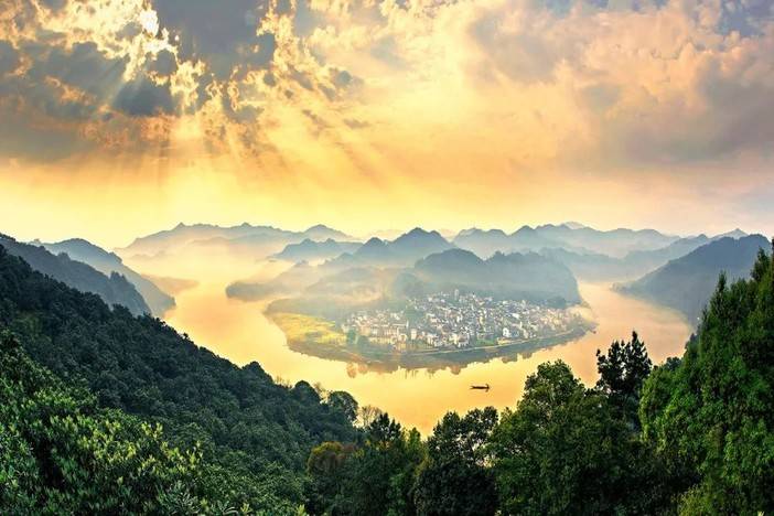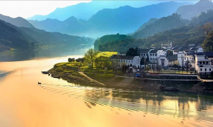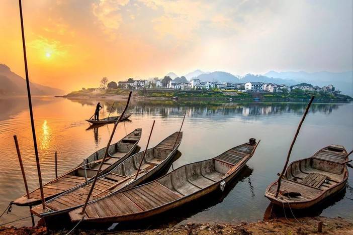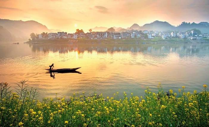 清晨,阳光弥漫江畔,轻风摇曳水面,新安江曲折蜿蜒,乌篷船三两靠岸,古村落纵横阡陌,油菜花掩映其间,真是船在江中走,人在画中游!