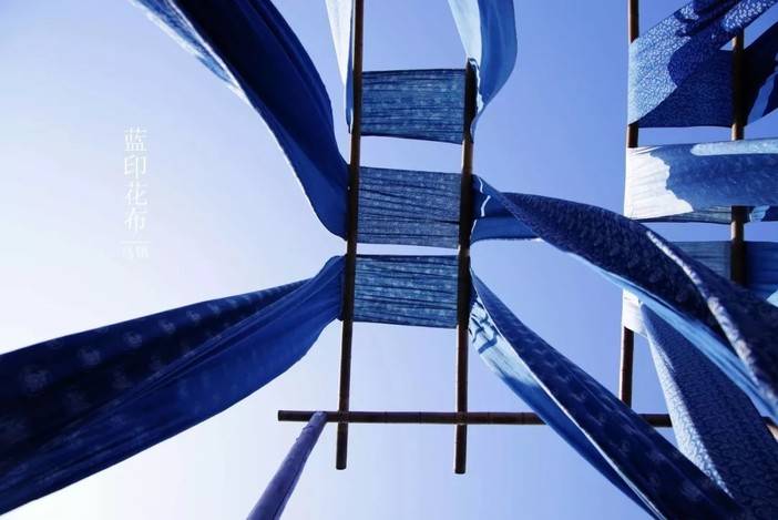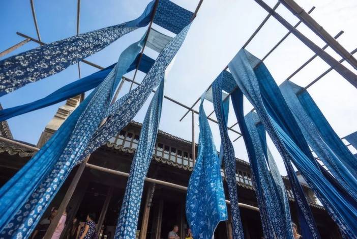 穿梭在各种蓝色的布匹中