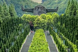 神农祭坛地处湖北神农架旅游开放区木鱼镇,是神农架旅游的南大门,也是中心旅游区。整个景区内青山环抱,美丽而幽静。景区分为主体祭祀区、古老植物园、千年古杉、蝴蝶标本馆、编钟演奏厅五大部分,其主体建筑是神农巨型牛首人身雕像,像高21米,宽35米。雕像立于苍翠群山之间,以大地为身驱,双目微闭,似在思索宇宙奥秘。祭祀区内,踩在脚下的是代表天和地的圆形和方形图案,在代表地的方形图案中,五色石分别为五行学说中的金、木、水、火、土。