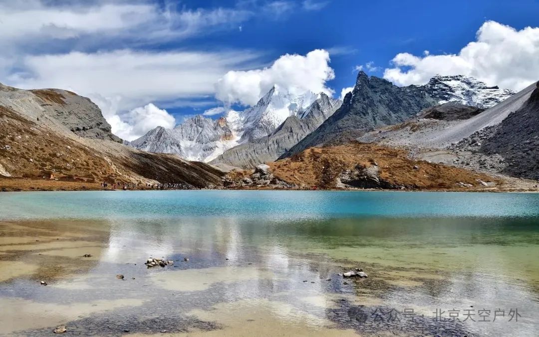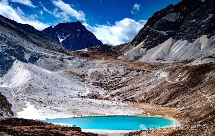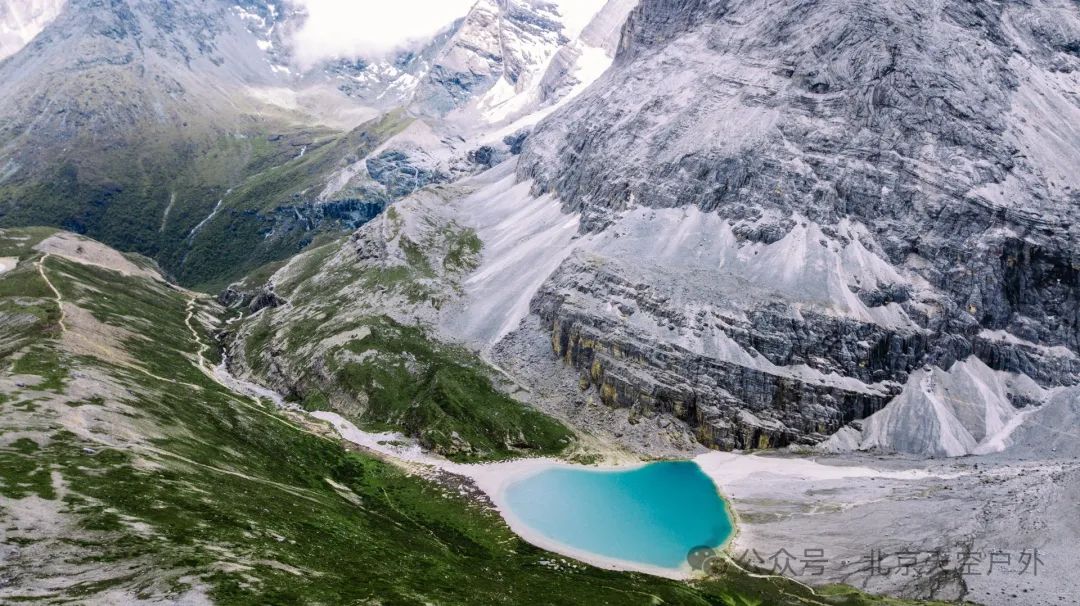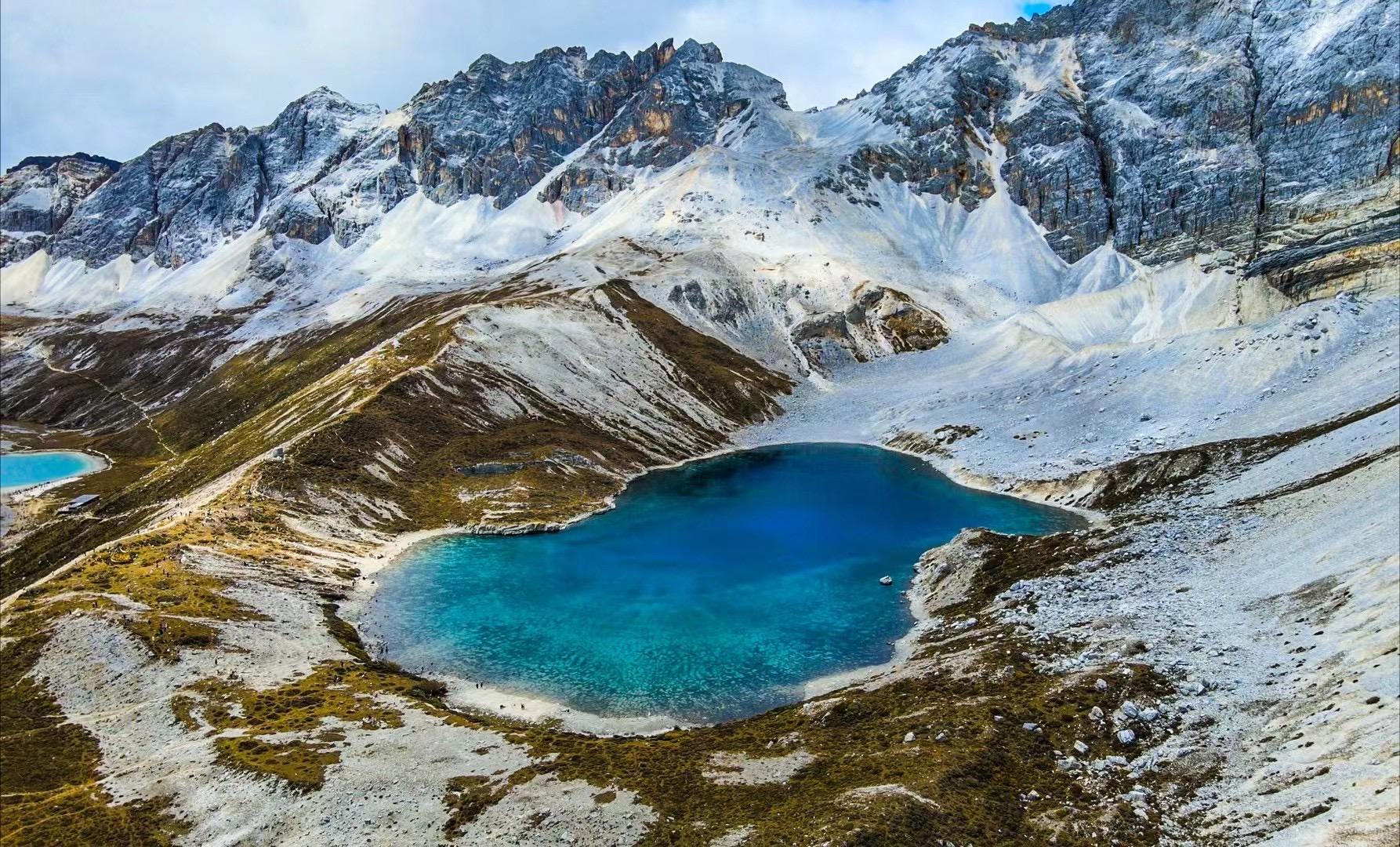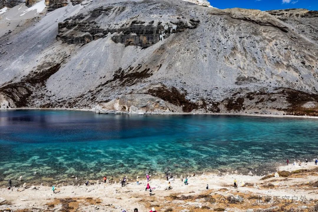 这里四周雪山环绕,湖水清莹碧蓝,湖畔则是一圈乳白色环绕,故称牛奶海。