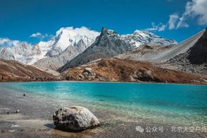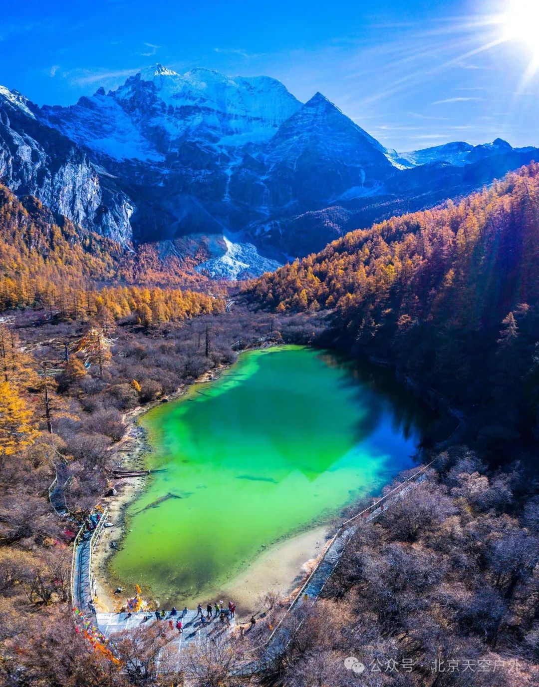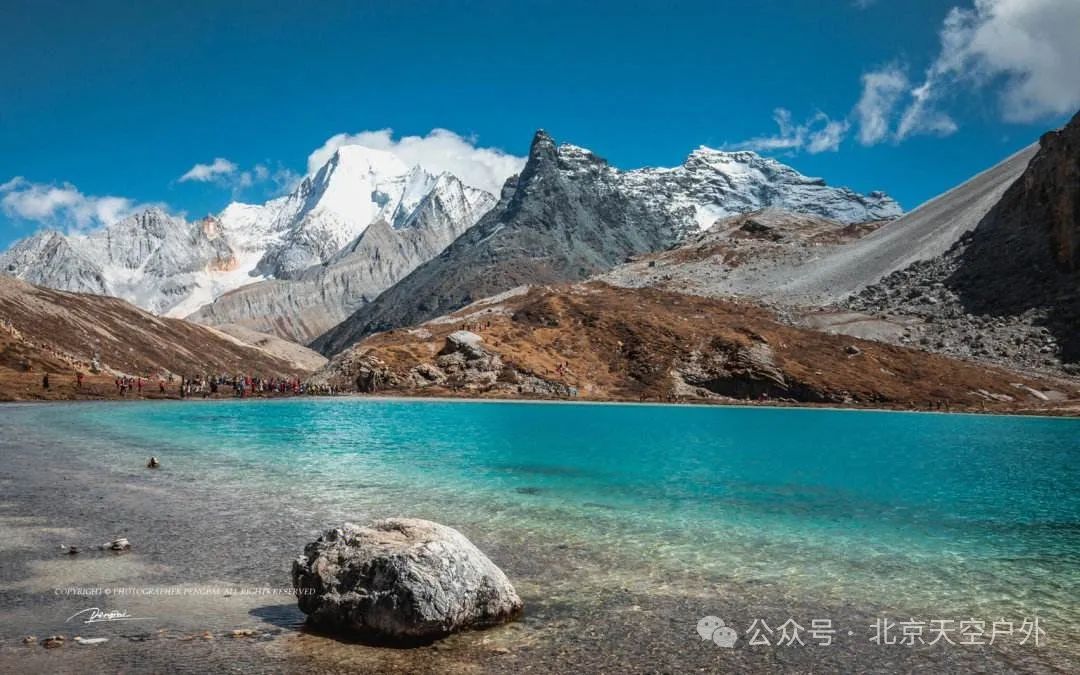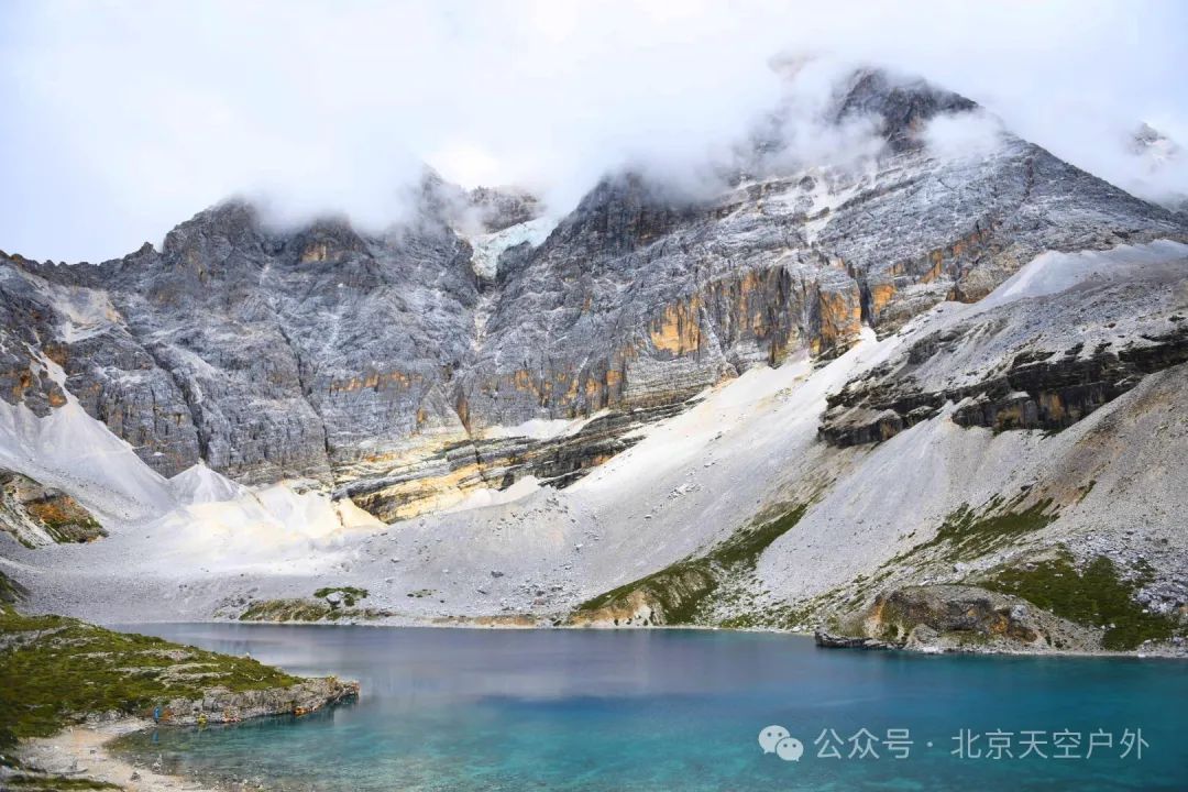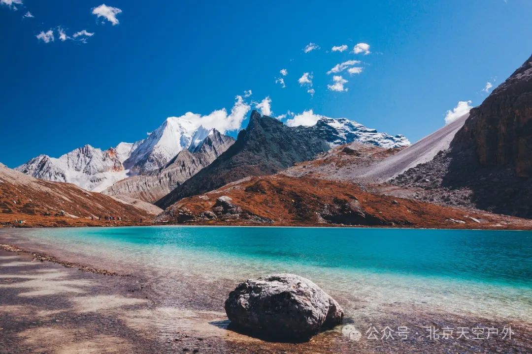 这里四周雪山环绕,湖水清莹碧蓝,湖畔则是一圈乳白色环绕,故称牛奶海。