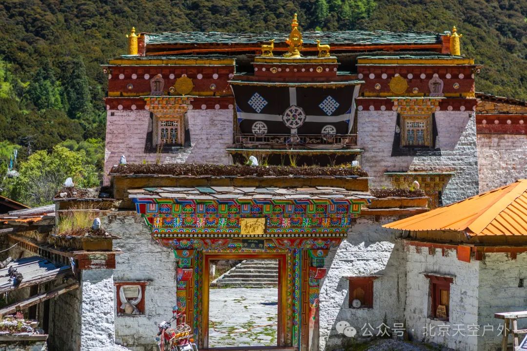 海拔3880米的冲古寺位于仙乃日雪峰脚下,建寺年代已无从考证。该寺院已被严重毁坏,目前只剩下一片残垣断壁。在老寺庙傍建有一个二层房屋,有一个喇嘛负责管理过往旅客的入住(现在由于景区规定,很难再住进去)及保护周围生态环境。一层为客房及喇嘛房间,二层为经堂,游人不能上二楼。每日早上及下午喇嘛都要熏香念经,每当这时诵经声和法豉声在寂静的山谷中回响,使这里显得更加神圣和神秘。