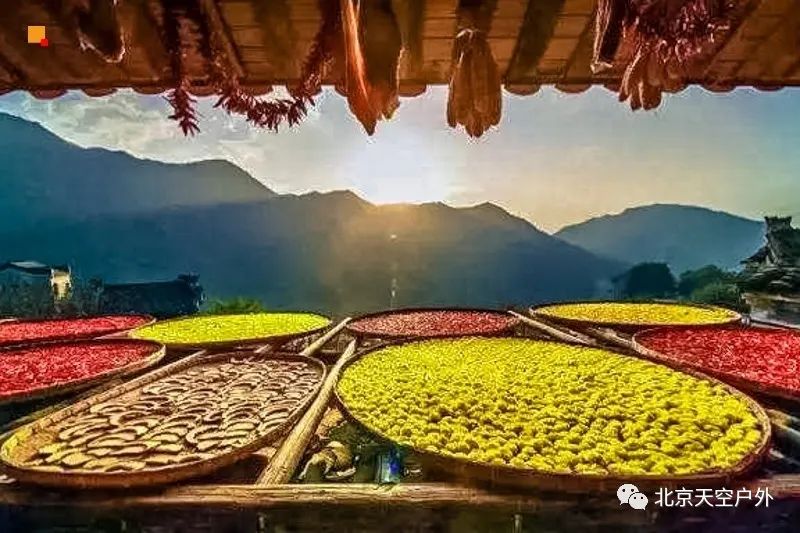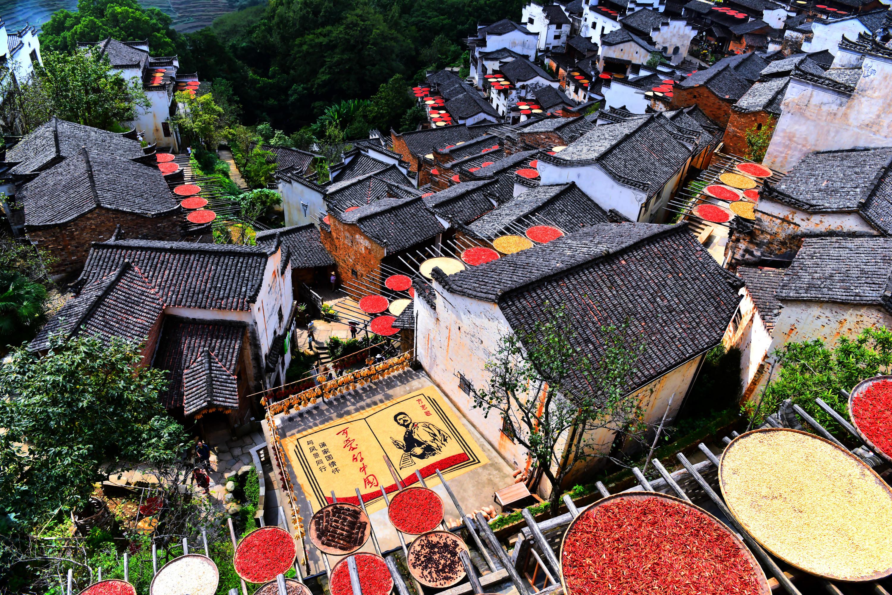【篁岭晒秋】 挂在山崖上的篁岭古村,“地无三尺平”,数百栋徽派民居在百米落差的坡面错落排布,每当日出山头,晨曦映照,整个山间房屋晒架上五彩缤纷的丰收果实,绘就出美丽的“晒秋”农俗景观。春晒茶叶、夏晒山蕨、秋晒果蔬、冬晒乡俗……一年四季延绵有续。“晒秋”是篁岭古村500年来延续至今的晒谷物特色民俗景象。它反映了以篁岭为代表的山居民众原生态的晒物农俗,是劳动人民对丰收喜庆和未来生活所赋予的质朴美好的期待,并逐渐沉积为一种民俗和文化。