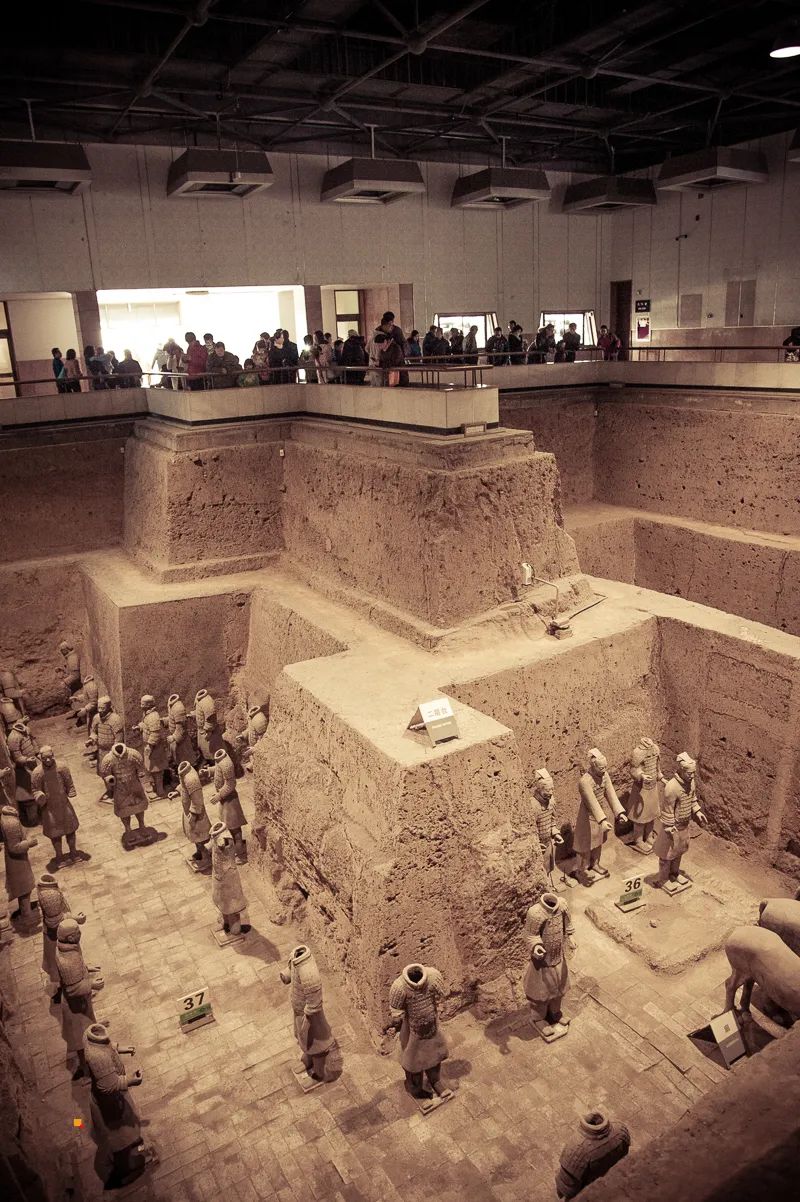 一号坑的东端排列着全身穿着战袍的战士俑210人,其余每排68人,前后、左右成行,共计204人,组成方阵的后卫。坑的中间,排列着有38路战车和步兵的纵队,组成军队的主体。