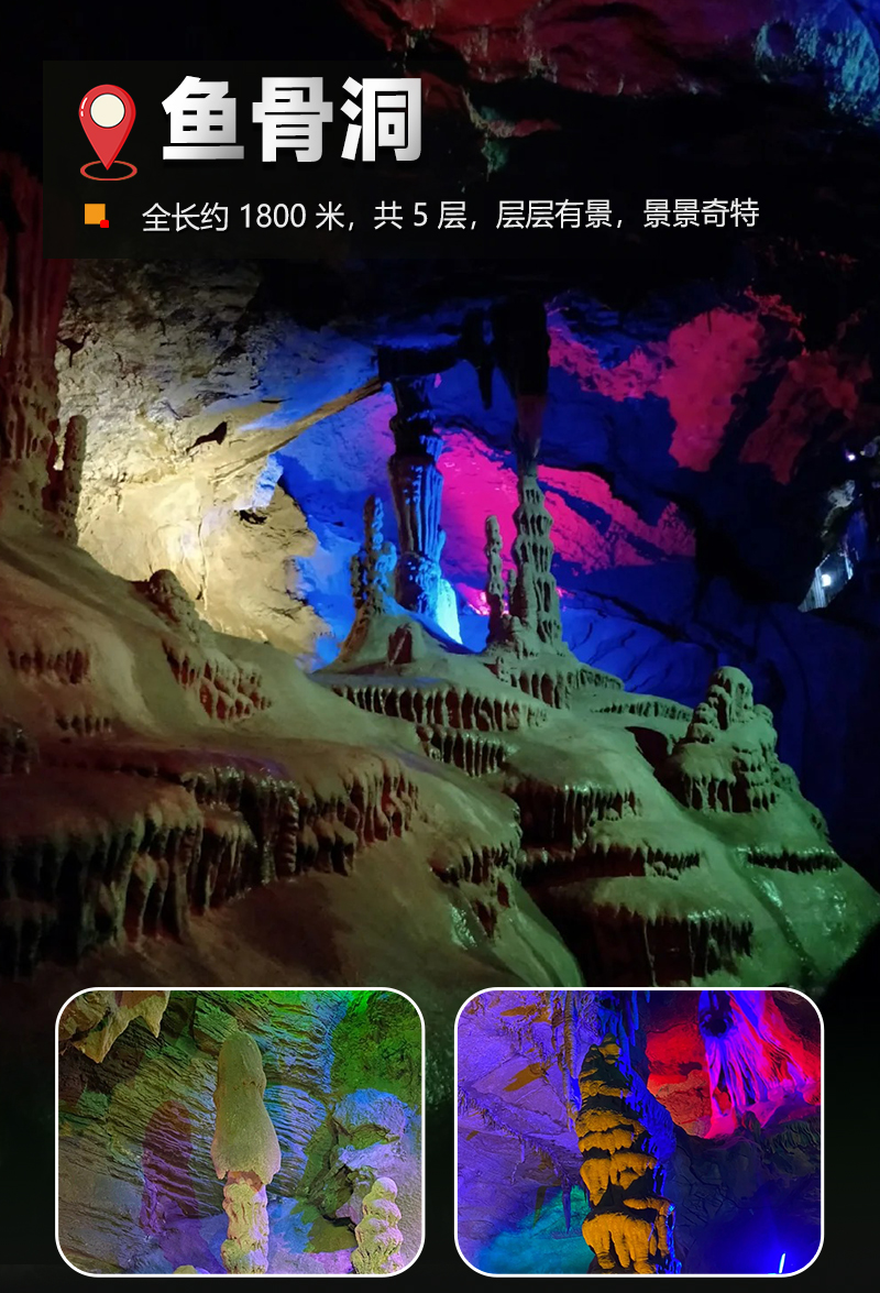 鱼谷洞景区名泉众多,鱼谷泉、神鱼泉、神洞泉、神天泉四大泉群,尤以鱼谷泉闻名。鱼谷洞内全长约1800 米,共分5层,层层有景,景景奇特,洞中有洞,洞洞相连。