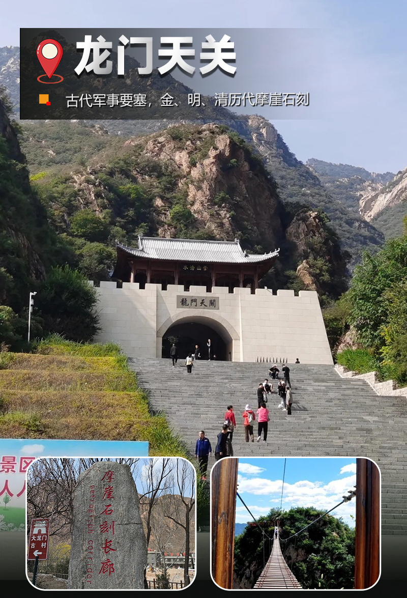 景区以历代军事遗址为主,有明代大龙门城堡、明清历代摩崖石刻群、上天沟九瀑十八坛、猿人谷等景点。龙门峡谷长1.2公里,峡谷中山峰非常险峻,很有气势。
