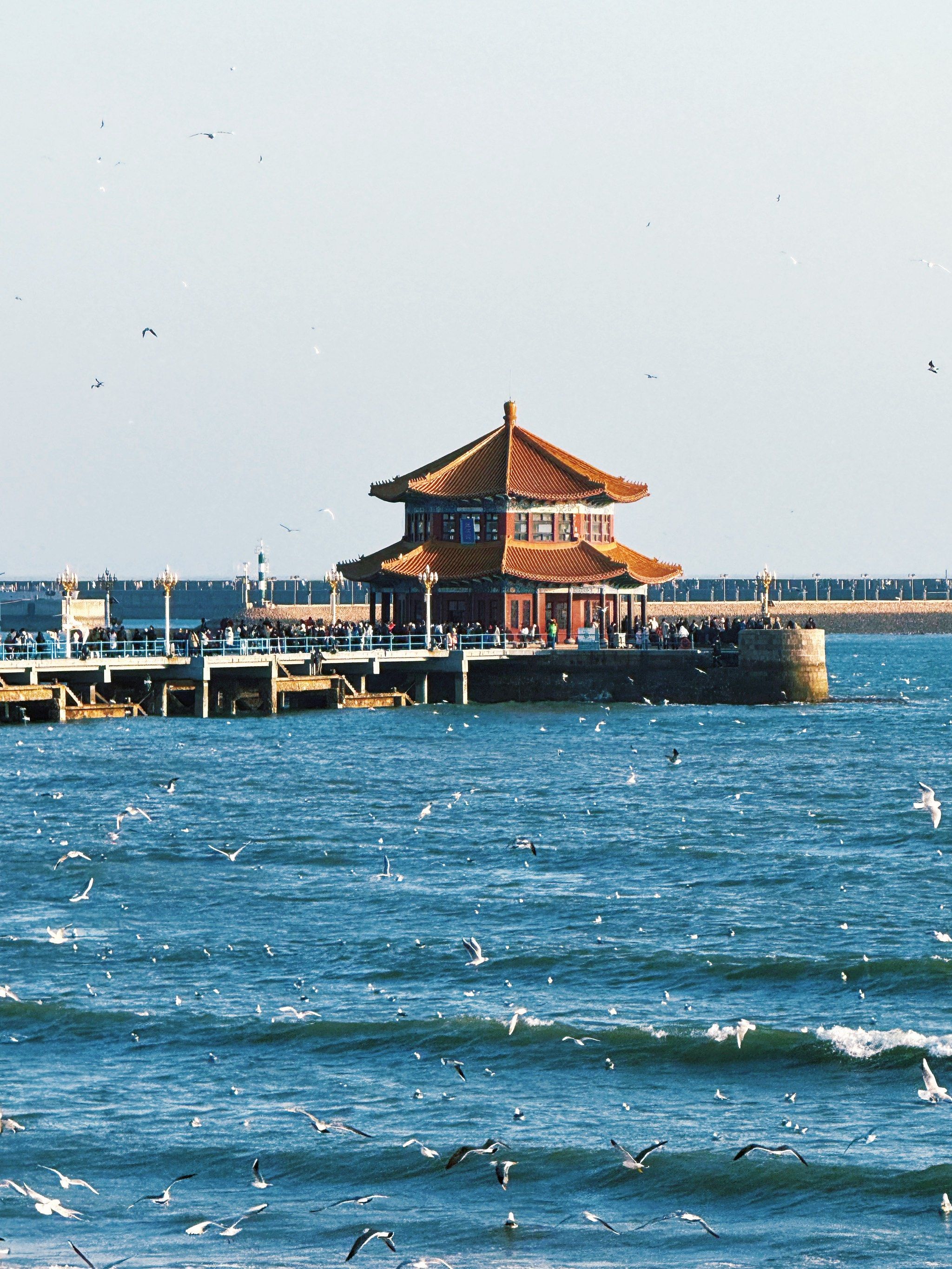 南端防波堤内部的八角楼被称为“回澜阁”。伫足于此,可以欣赏到青岛十景之一的“飞阁回澜”。