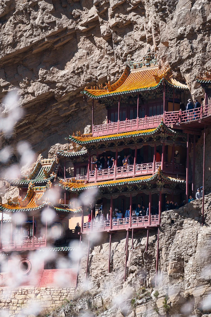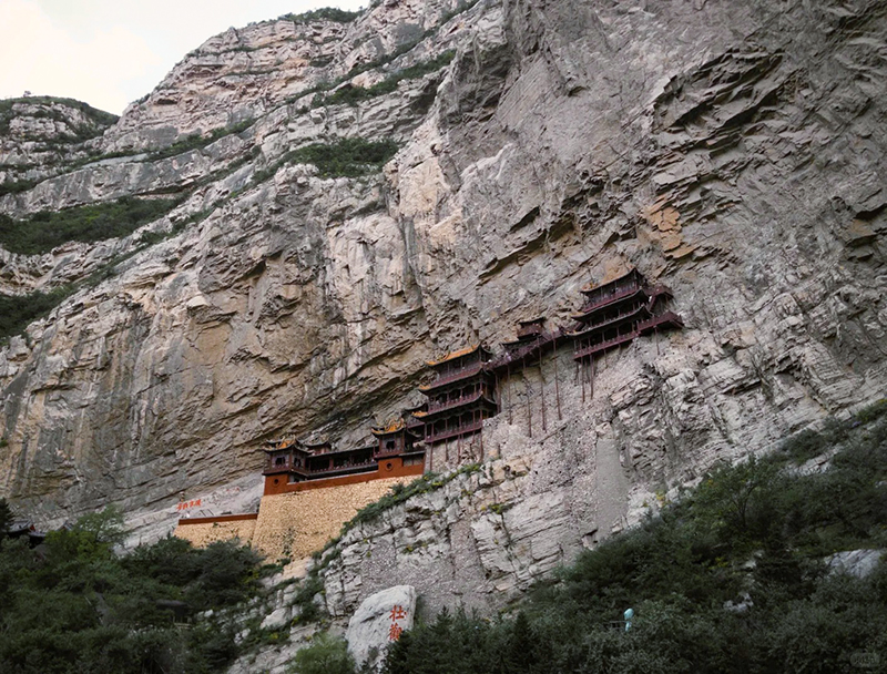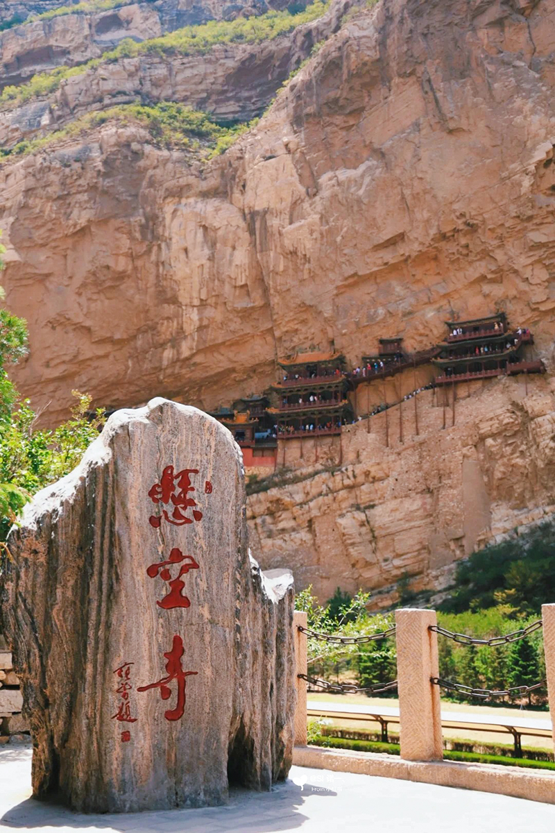 悬空寺就像悬挂在悬崖之上,全寺为木质框架式结构,值得惊叹的是它依靠榫接结构,嵌入崖内而不倒,距今已有1500多年历史,是国内现存最早、保存最完好的高空木构摩崖建筑,诗仙李白观后醉书壮观,徐霞客赞为天下巨观。