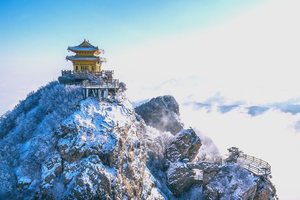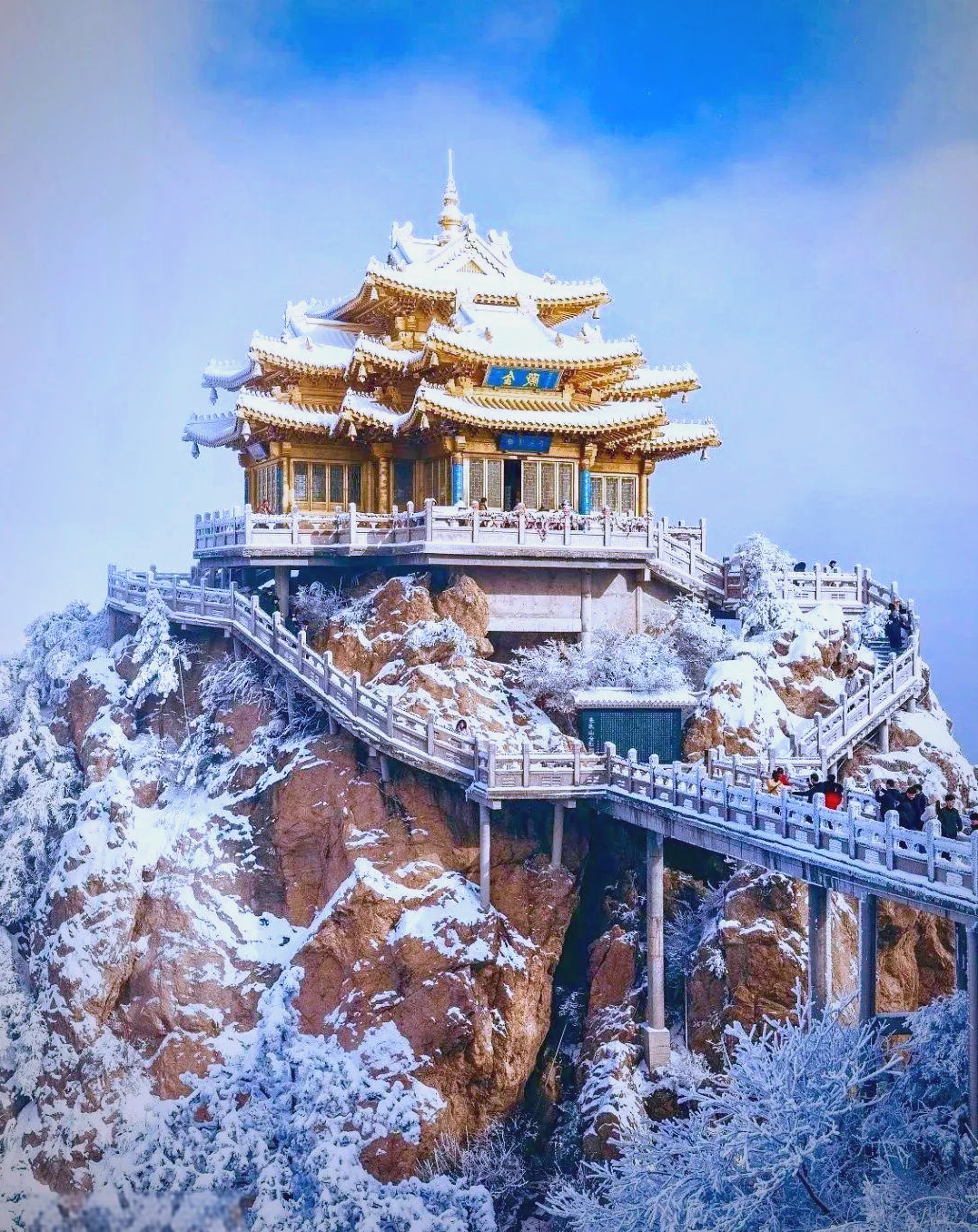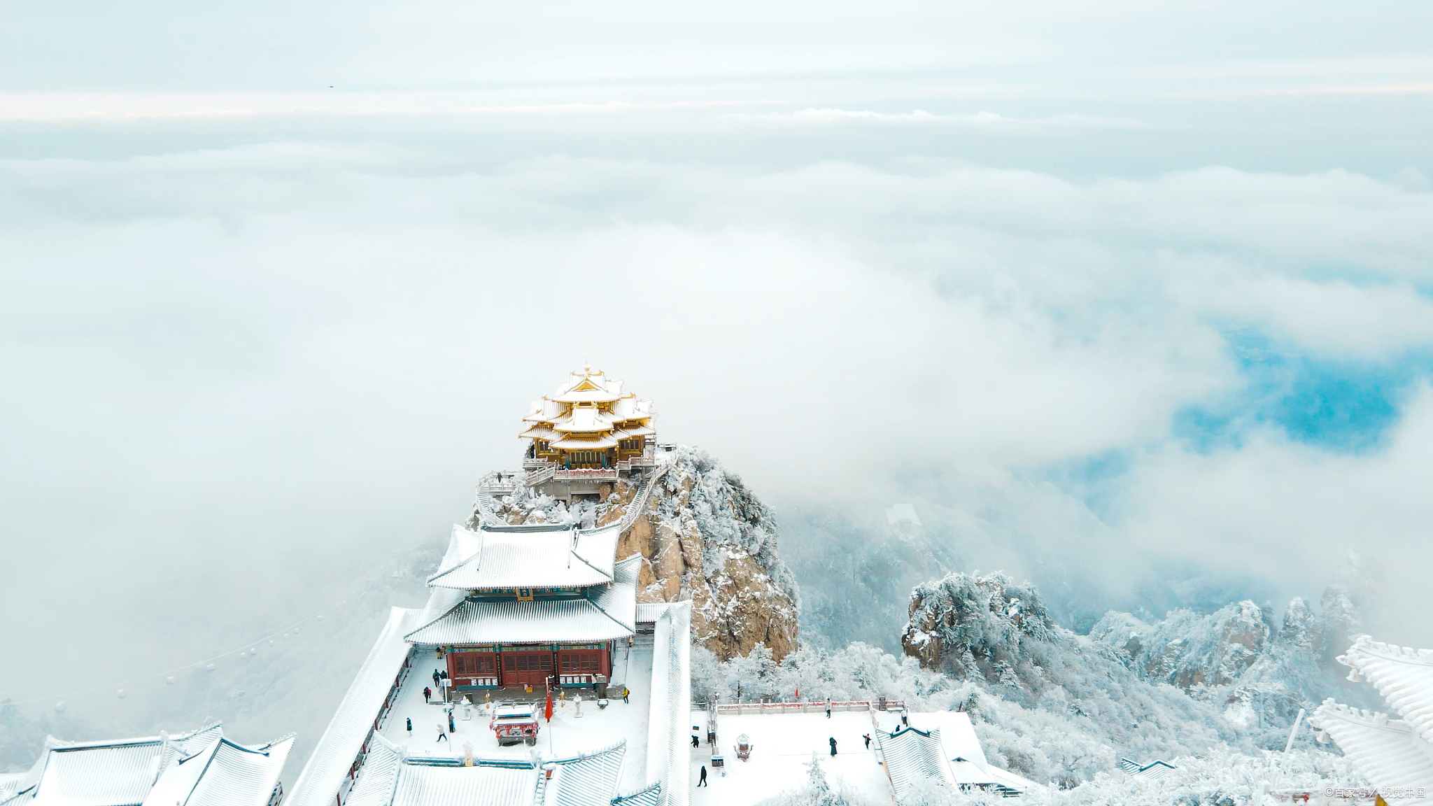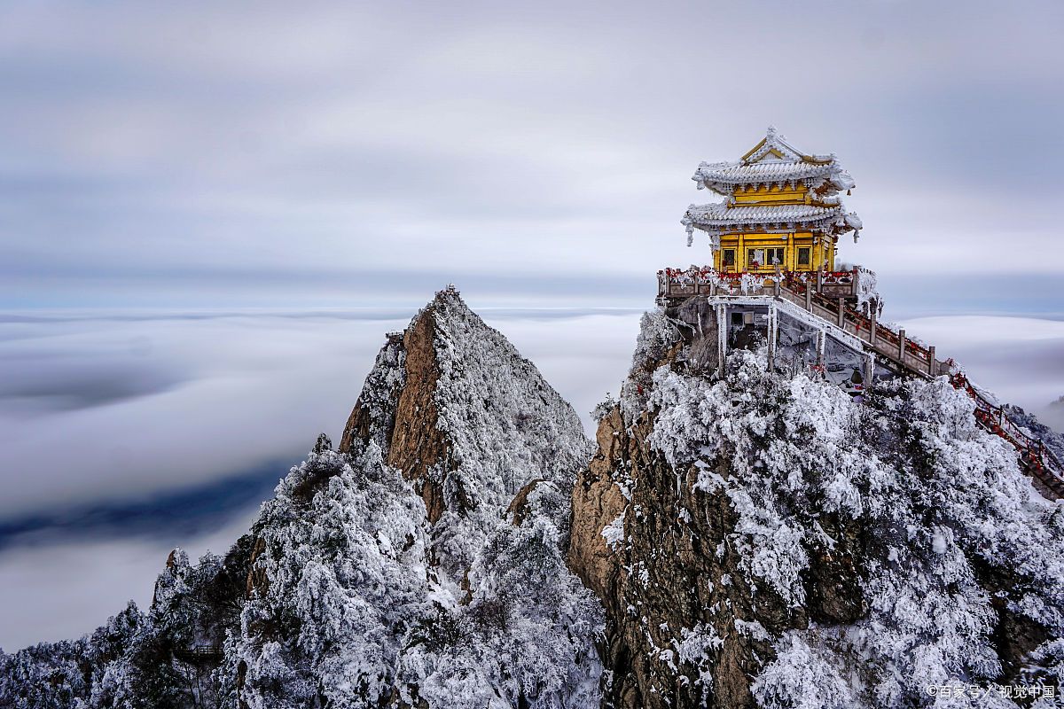 冬雪与松、石、云巧妙结合,配以晶莹冰挂、琉璃雾凇、宏伟金殿,将老君山装扮成绝美的人间仙境。