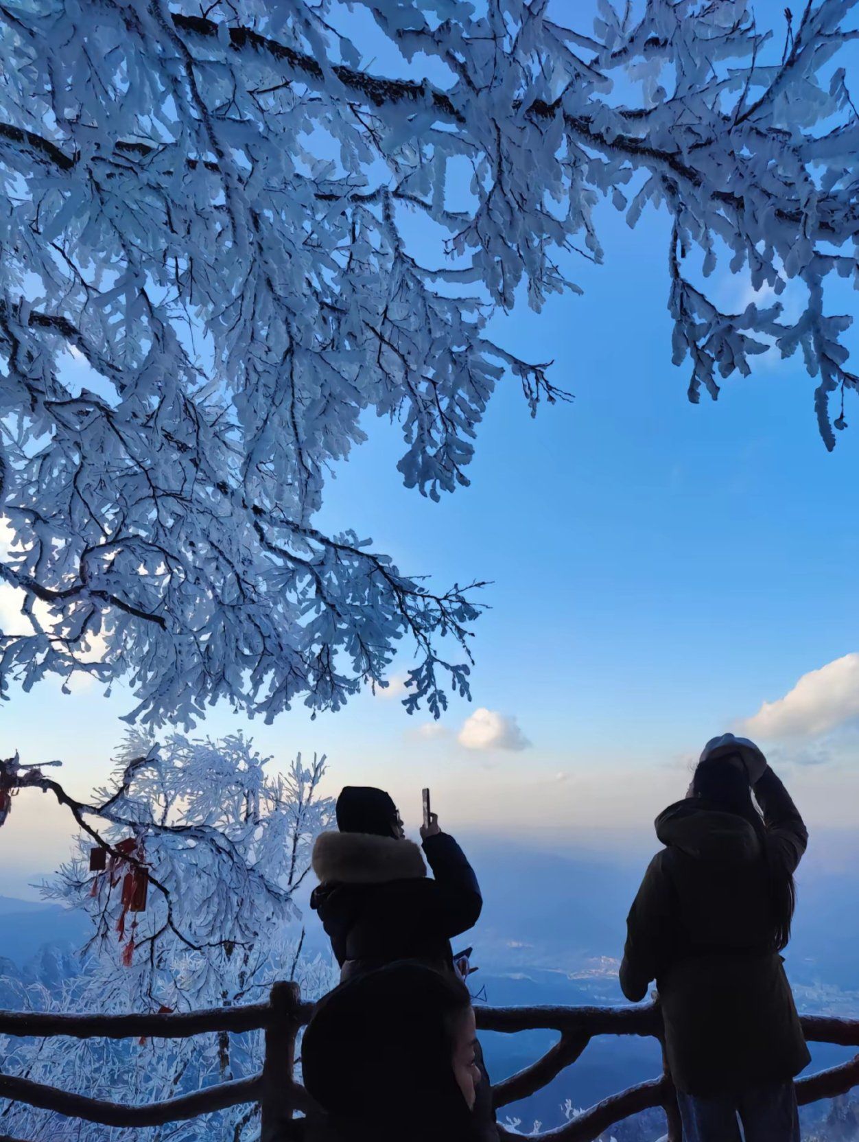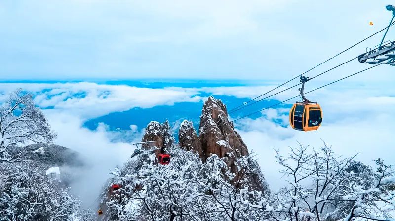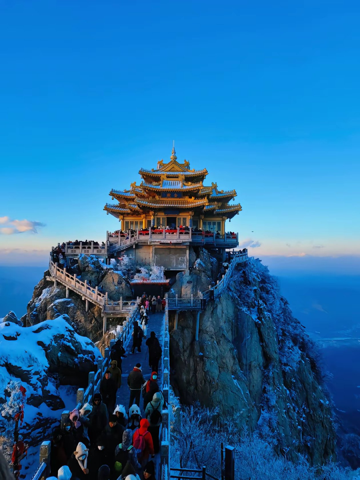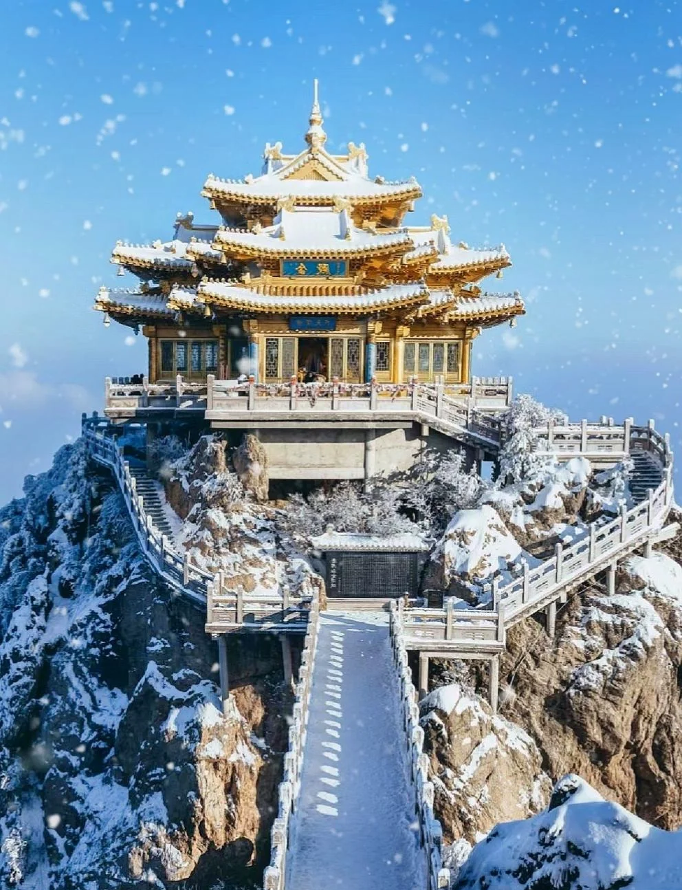 冬雪与松、石、云巧妙结合,配以晶莹冰挂、琉璃雾凇、宏伟金殿,将老君山装扮成绝美的人间仙境。