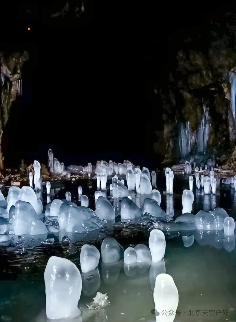 冰蘑菇洞位于河南省林州市合涧镇八达村附近,且有几处山洞,洞的形状呈口袋状,洞顶上滴下来的水,很快能结冰,逐步形成一整片的落地冰柱,或相拥一团,或独树一帜,高的大约60厘米左右,低的大约在5厘米左右,由于高矮不一,密布较大,如同茂密的蘑菇群,生长在山洞中。进入洞内,你会发现,目光所及之处,都是透明状的“蘑菇”,或相拥一团,或独树一帜,高的大约60厘米左右,低的大约在5厘米左右!