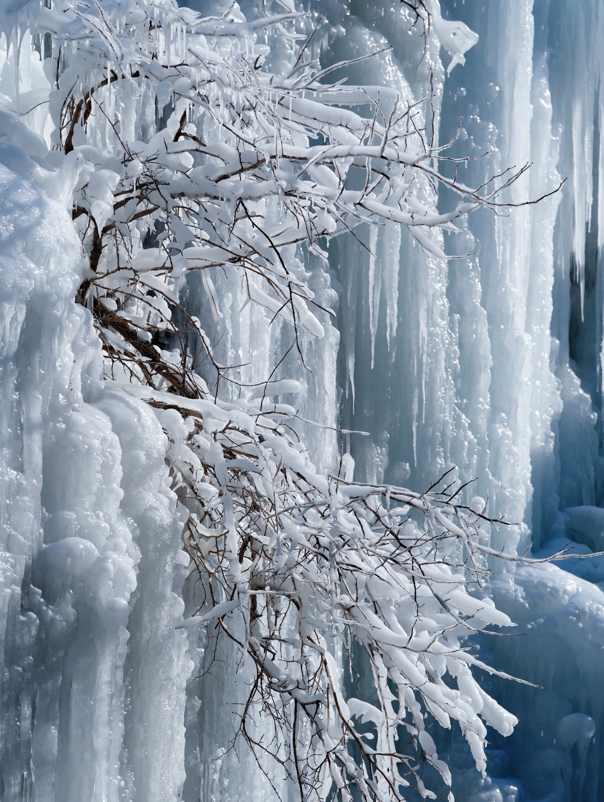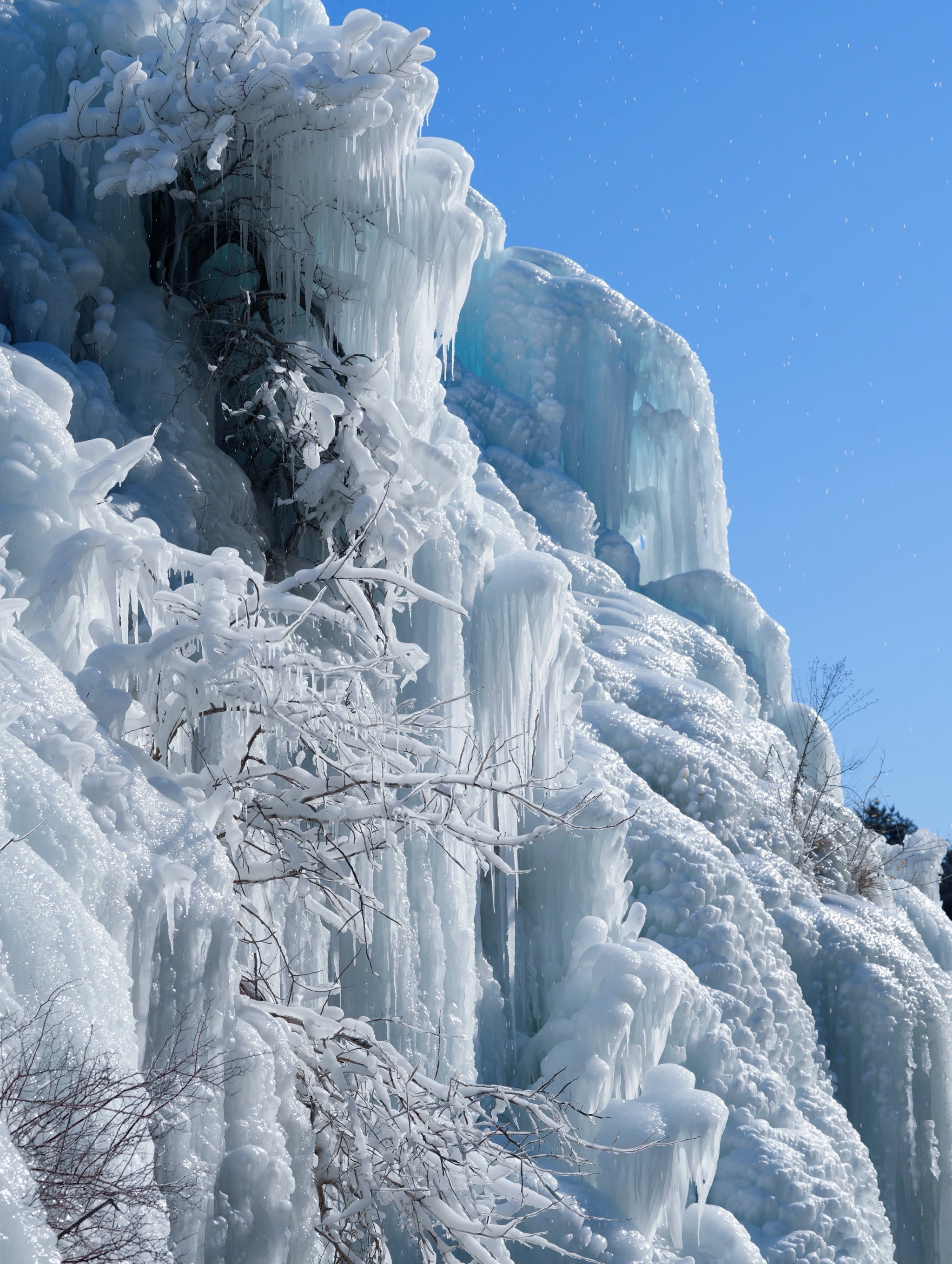 云瀑沟冰瀑面积达上千平方米,冰瀑依山势而走,浑然天成,步入景区,沿着小径向前,两旁一片冰雕玉砌,一簇簇晶莹剔透的冰柱高悬在峭壁之上,冰幔、冰挂层层叠叠、错落有致、形态各异。
