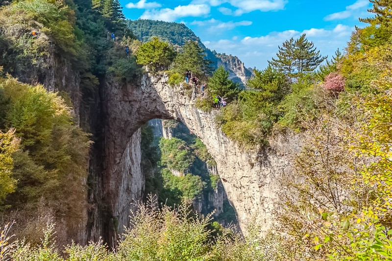 继续前行,我们抵达了【天生桥】,这座北方最大的天然石拱桥,横跨于两座危崖之间,其跨度之大、高度之高,站在桥上,深不见底的深渊与圆拱形的桥洞,令人叹为观止。