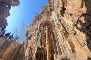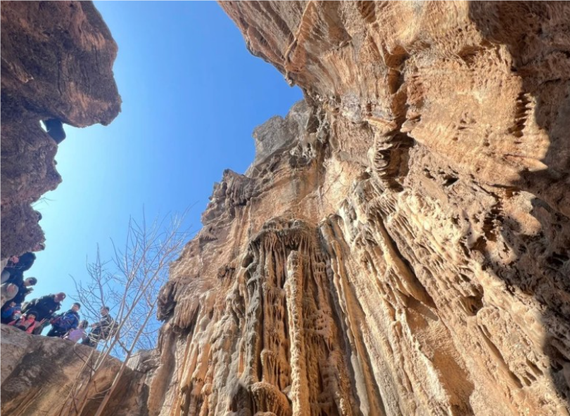 本是溶洞塌陷的遗迹,坑口直径约 5-6 米,深度最大达约 14 米,石灰岩层携带着 4.4 亿 - 4.8 亿年前的故事。狭小的坑口下,石笋、石柱拔地而起,钙华在壁上肆意蔓延,坑内能看到钟乳石、石花、石幔等景观。