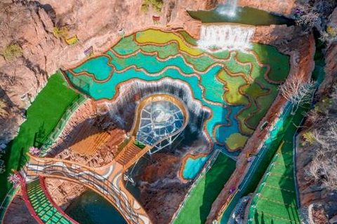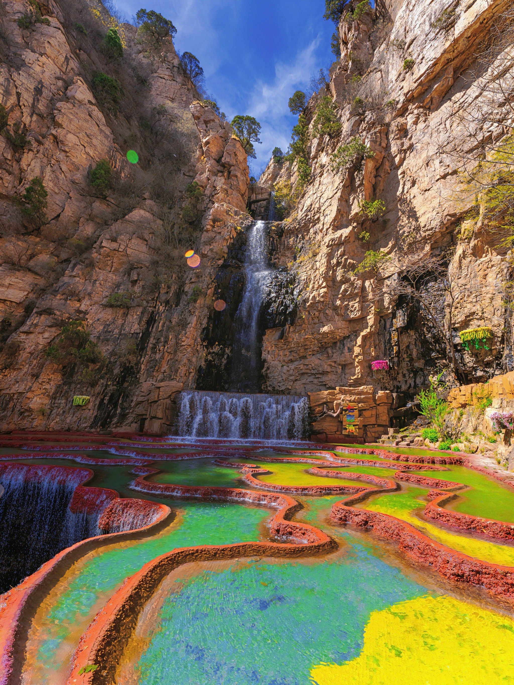 七彩池是由大大小小的水池组成,所有的池水来自同一条瀑布,水流到各个水池里,颜色却不同了。池边由金黄色的石粉凝结而成,像一圈圈彩带,把大大小小的水地围成各种不同的形状,有像葫芦的,有镰刀的,有像月牙的,有像盘子的,有像莲花的……水池的水还不止一种颜色,明明是清水,为什么在水池里会显出不同的颜色来呢?想要知道其中的奥秘,还需要您亲自来一探究竟~