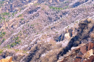 凤凰岭山桃花花期从 3 月中旬持续到 4 月中旬,之后杏花、榆叶梅、碧桃、连翘等各类山花陆续开放,一直持续到 5 月初,整个春季都有花可赏。凤凰岭有近万株山桃树,每到春季,漫山遍野的山桃花盛开,将山坡染成粉红色,放眼望去如粉色海洋,从远处就能闻到芬芳,场面极为壮观。