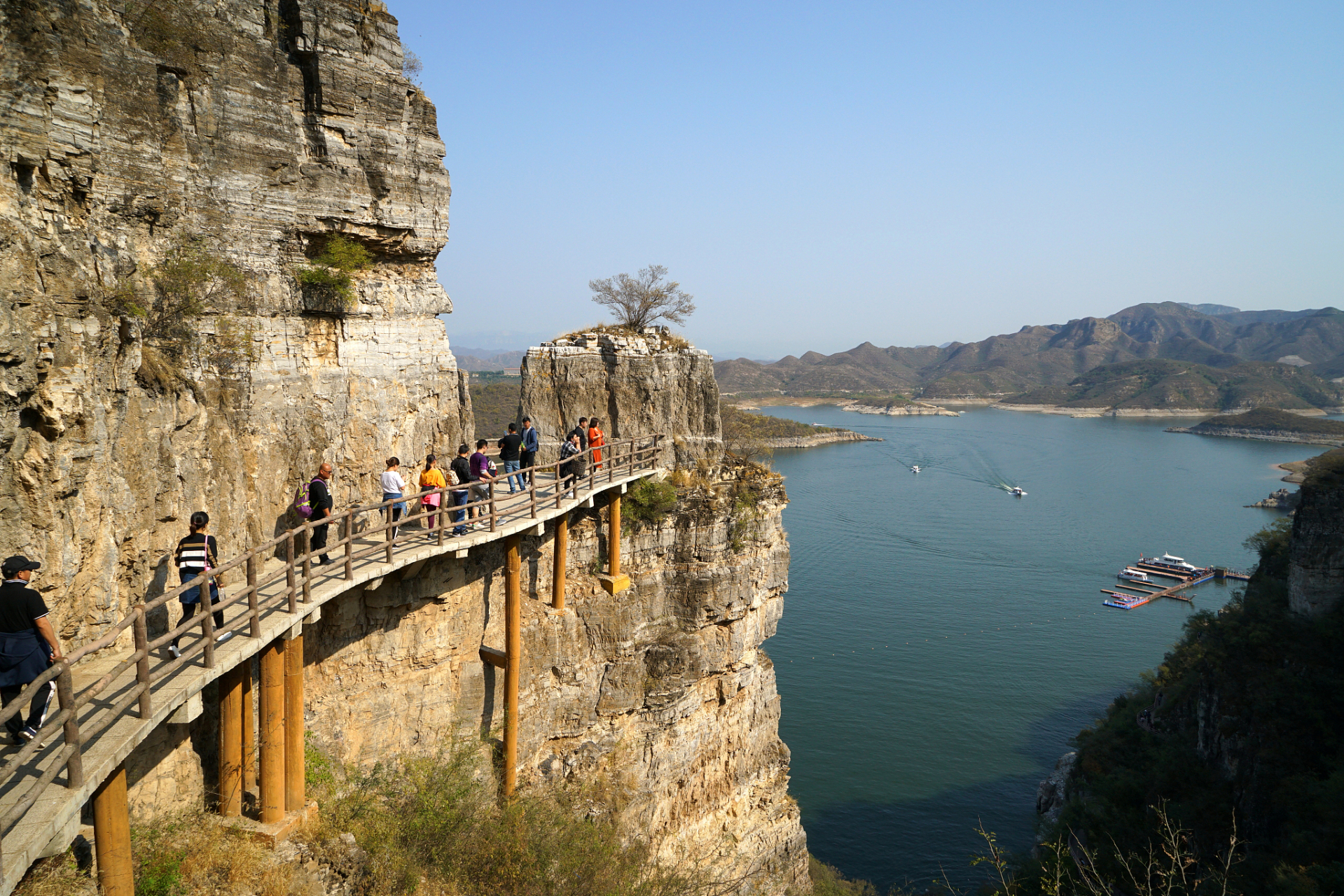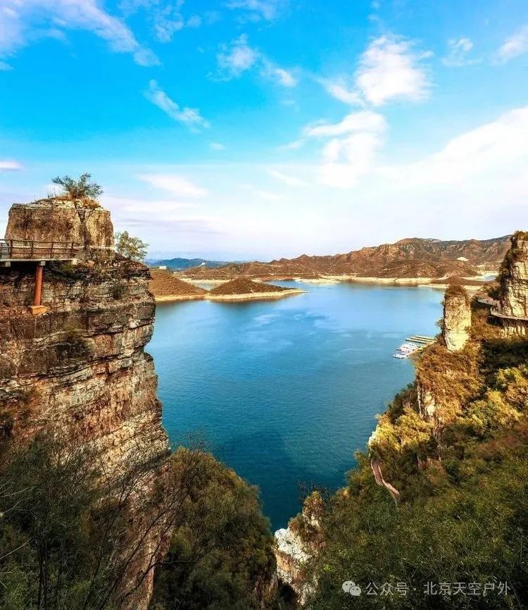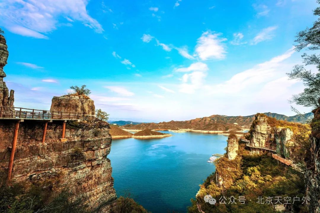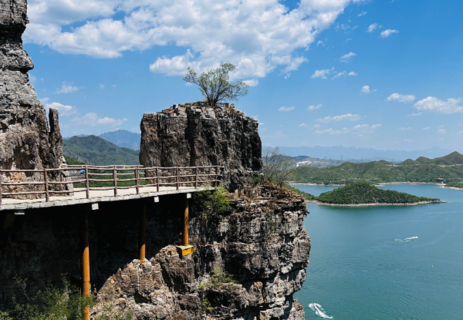 我们到达易水湖码头,一起坐船到湖中心去上高山栈道观看全景,逛长空栈道——赤壁拍摄外景地。易水湖风景区因可与漓江风光相媲美,故而被誉为“北方小桂林”。易水湖是利用四周高耸的山势而修建的一座人工湖,周围环境优美,清澈纯净,景色宜人。藤萝倒挂的悬崖峭壁,勾划出南国风光的桂林山水画,并且留下了七仙度国舅的美丽传说,可谓是欲知桂林风景,何必千里下江南。