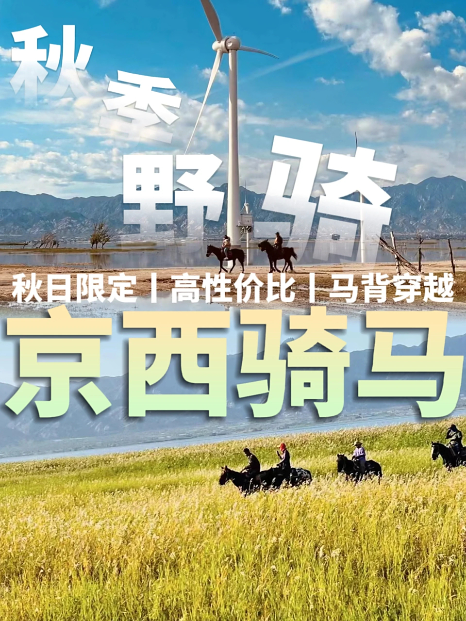 - 13:30|开始骑马沿官厅水库穿越,沿途官厅水岸湖光山色,水中倒映的风车群,过膝的芦苇荡,遮天的松树林,风景如画,可在景色绝佳处拍照休息,全程20KM,约3小时。