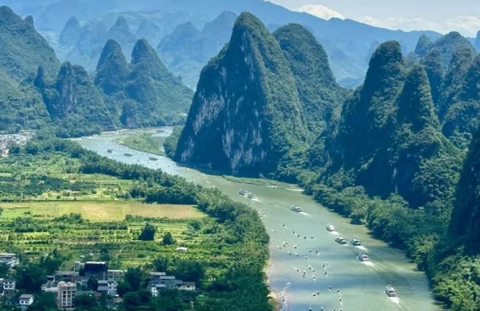 线路起点,这里拥有绝佳的观景视角,能将漓江的 S 形大拐弯尽收眼底,连绵的喀斯特山峰错落有致,在清晨的薄雾或傍晚的余晖中,如梦似幻,是摄影爱好者的天堂。