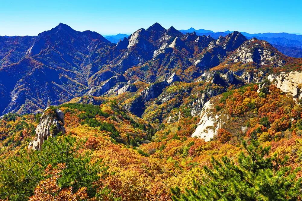 云蒙山的万亩林海,在蓝天的衬托下,蔚为壮观。满山遍野的树叶,层林尽染,使整个山林姹紫嫣红,伴着微微凉爽的秋风,一片片树叶在风中舞动。