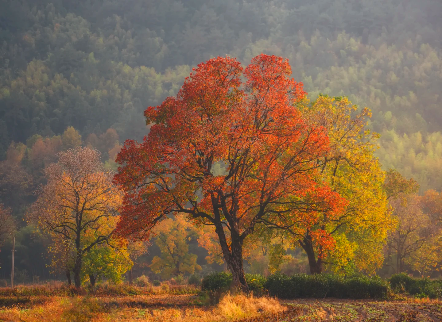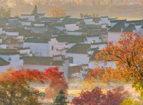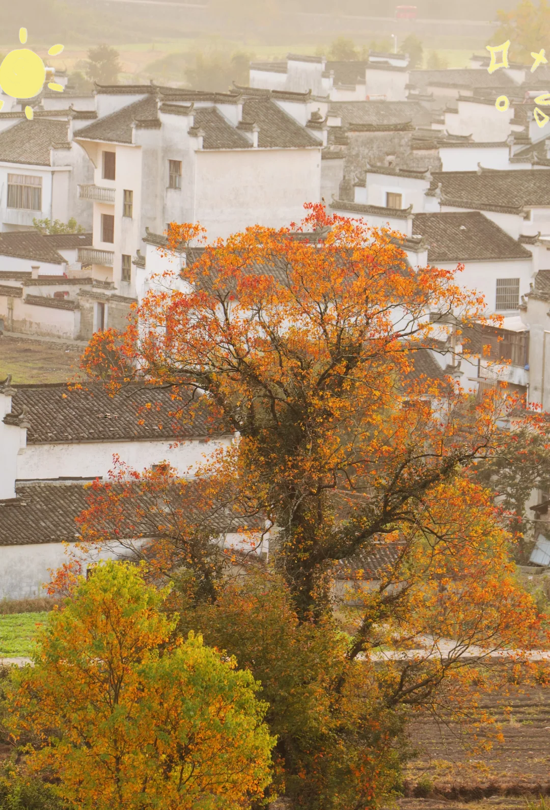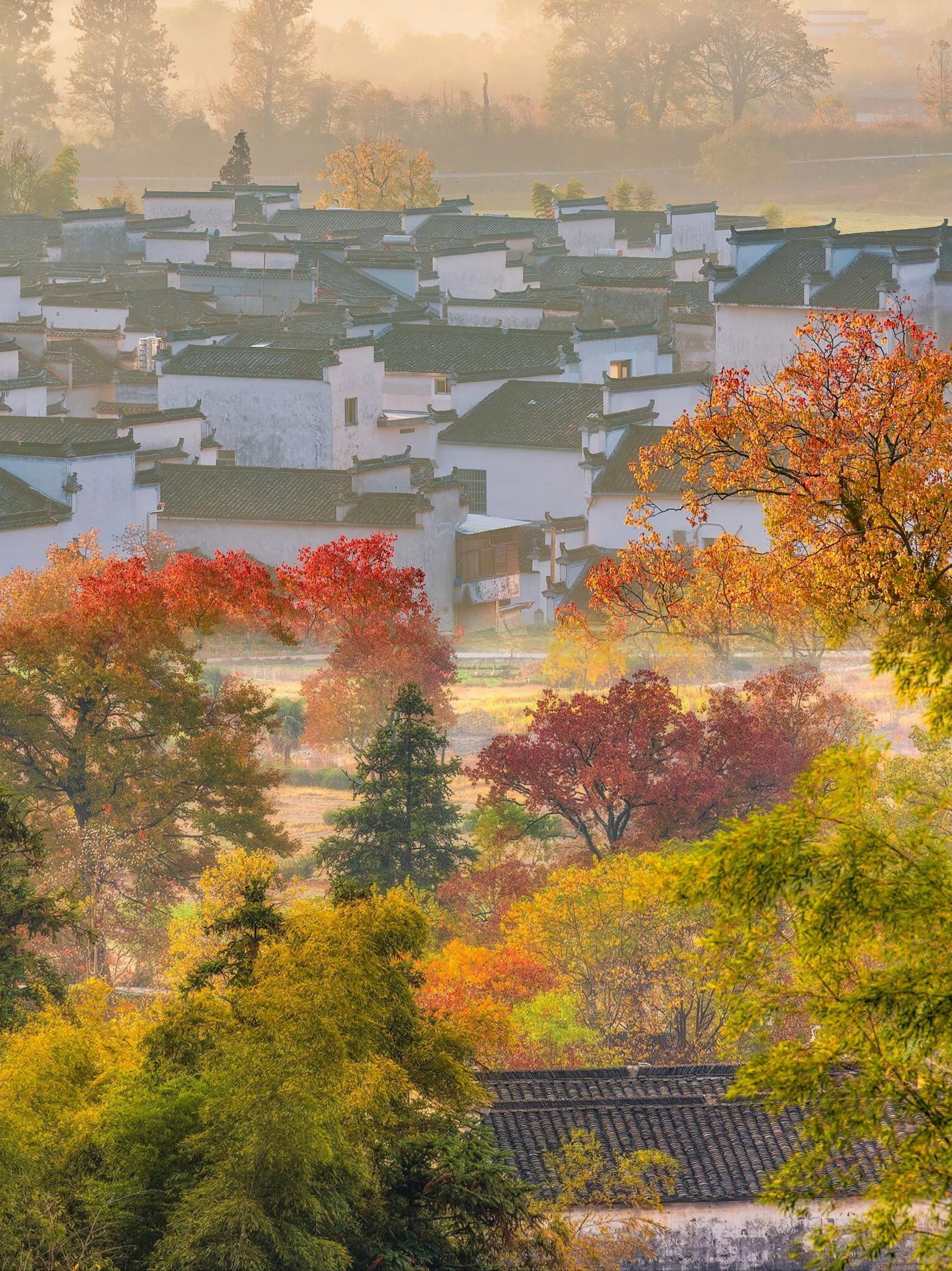 秋日登卢村观景台,眼前是铺展的诗意画卷。火红的乌桕树、金黄的稻田与翠绿草木交织,如打翻的调色盘。日出时分,霞光穿透薄雾洒下,炊烟袅袅升起,古村、秋树与田园相映,宛如浓墨重彩的油画,满是秋日静谧与烟火气。
