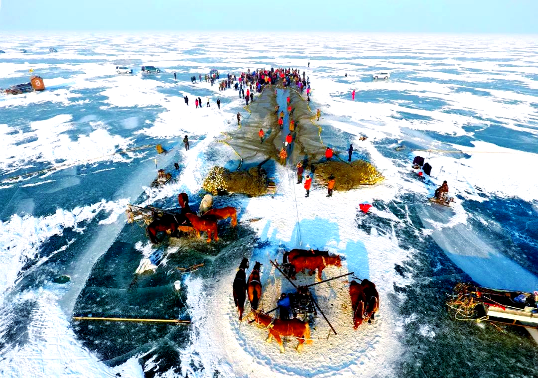 - 早餐后,集合前往【查干湖冬捕】现场。到达冬捕现场之后,乘车来到湖中央。鱼捕头选好位置,下窝子,开冰眼,等鱼入网,冰面冬捕热闹十足,鱼群出湖,活蹦乱跳。