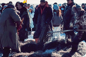 查干湖冬捕是吉林省前郭尔罗斯蒙古族自治县传统冬季渔业生产方式,起源于辽金时期,以祭湖、醒网、凿冰、撒网等流程形成独特渔猎文化。该习俗于2008年被列入国家级非物质文化遗产名录!装满鱼的网肚无法拉出冰面,只能从狭小的出网口逐条捞出。当渔网被一点点出,“冰湖腾鱼”的盛景再次呈现。