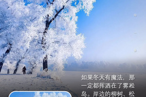 雾松岛是松花江上冲击而成的江中小岛,因雾凇多且美丽而得名,常能拍出风光大片,受到大批摄影爱好者的追捧。每到寒冬,不冻的江水中升腾的水雾遇冷,在树上凝结为霜花,从远处看正是传说中的玉树琼花,美不胜言。