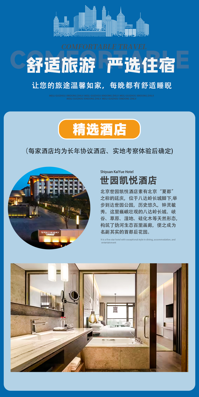 - 入住酒店:抵达延庆世园凯悦酒店(五星级标准),酒店位于延庆“夏都”核心区,毗邻世园公园,拥有283间带私属阳台的客房,设计融入延庆山水元素,配备室内恒温泳池、健身房及地道美食餐厅,可俯瞰世园景致,是舒适的休憩之选。