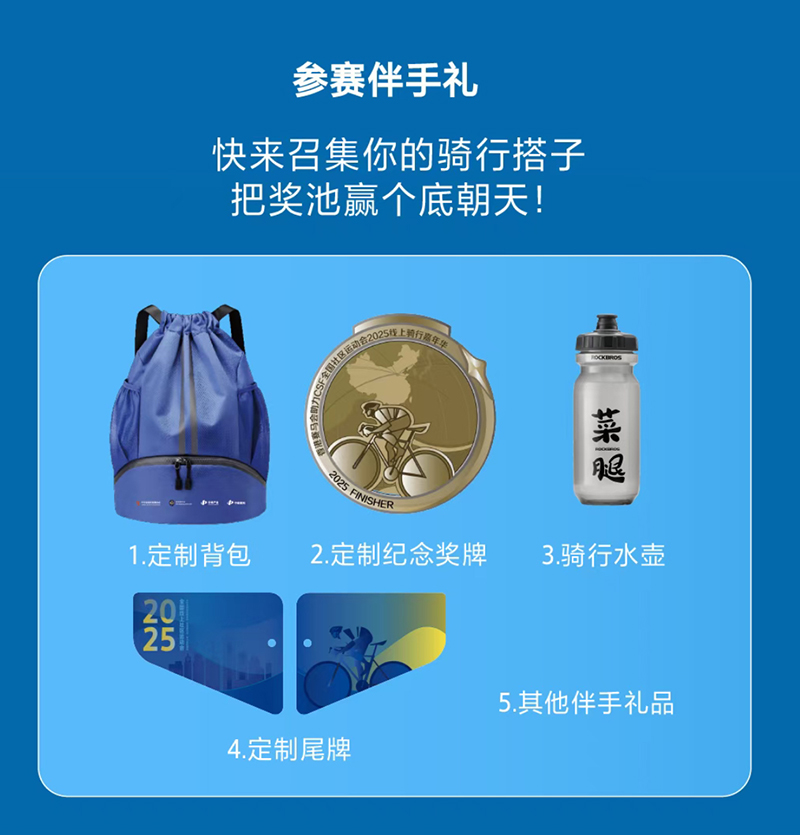 - 基础参与礼:定制抽绳背包、骑行水壶、定制尾牌(含2025标识)、纪念奖牌(镌刻骑行图案)。