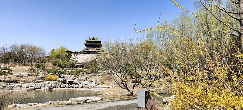 4)永宁阁:坐落于天田山顶,是园区的制高点,登阁可南望长城、北眺海陀山,将妫河风光与园内美景尽收眼底